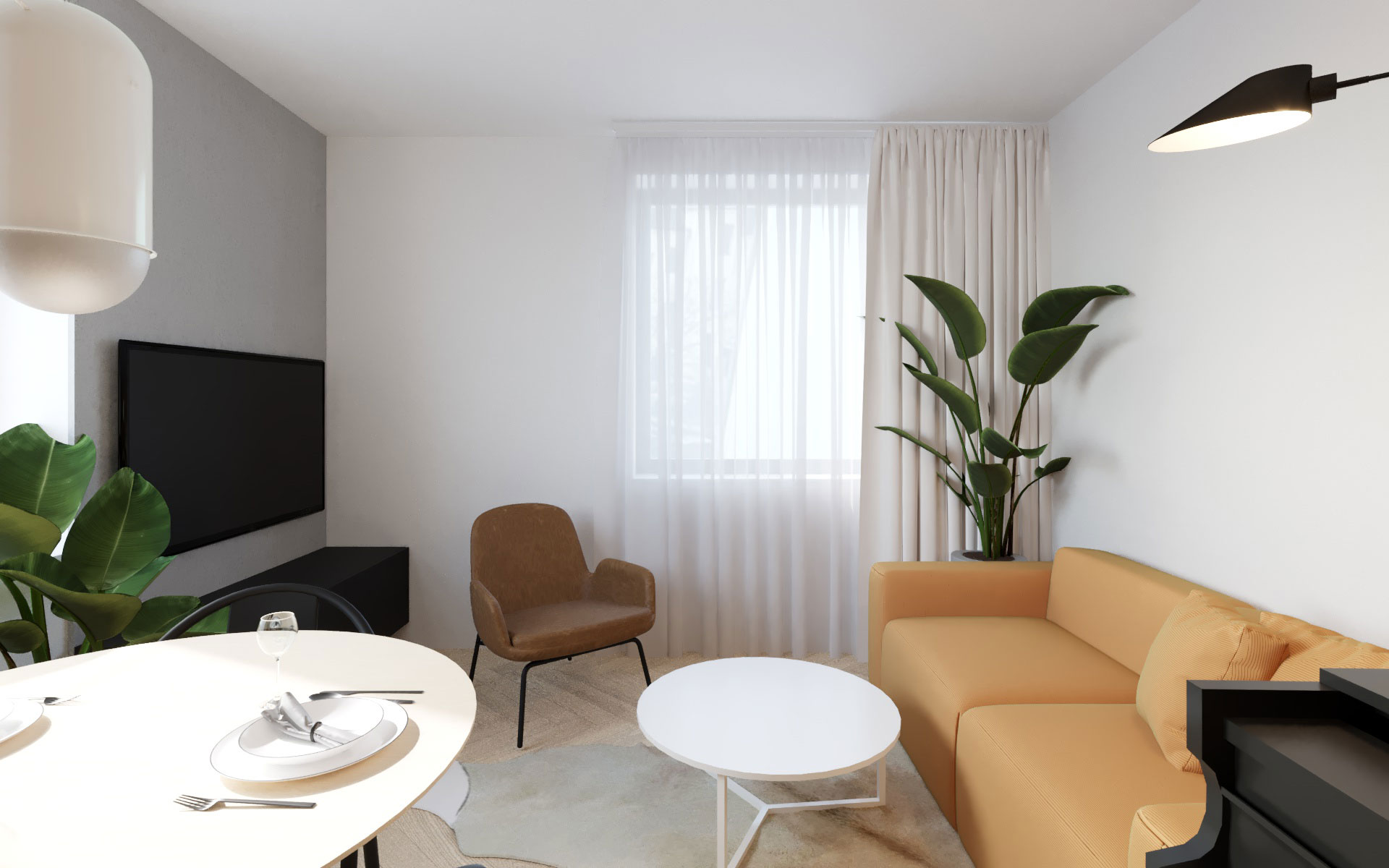 Bílý interiér rodinného domu s hřejivým žlutým akcentem