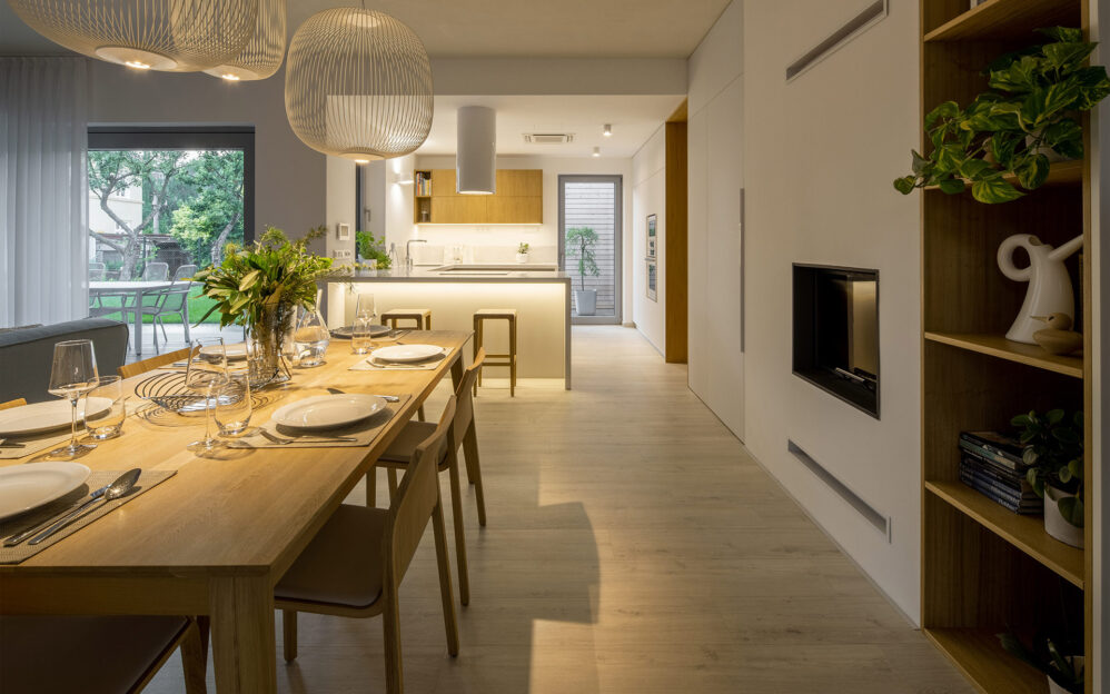V přízemí domu je velká obytná část s kuchyní, která je napojena přímo na velkou terasu. Pán domu nechtěl být odtržen od dění v domě ani zahradě a tak jeho pracovna je částečně připojena k obývacímu pokoji a stůl nasměrován k oknu. Na práci v klidu se dá pracovna uzavřít velkými posuvnými dveřmi. V kuchyňské části, na kterou navazuje velký jídelní stůl u krbu, jsou hned dva skryté průchody. Jeden, jak je obvyklé je do spižírny, a druhý vede do ložnicové části domu s wellness pro maximální intimitu. Ve druhém patře najdete pokoje dvou hudebně nadaných chlapců a pracovnu / pokoj pro hosty.