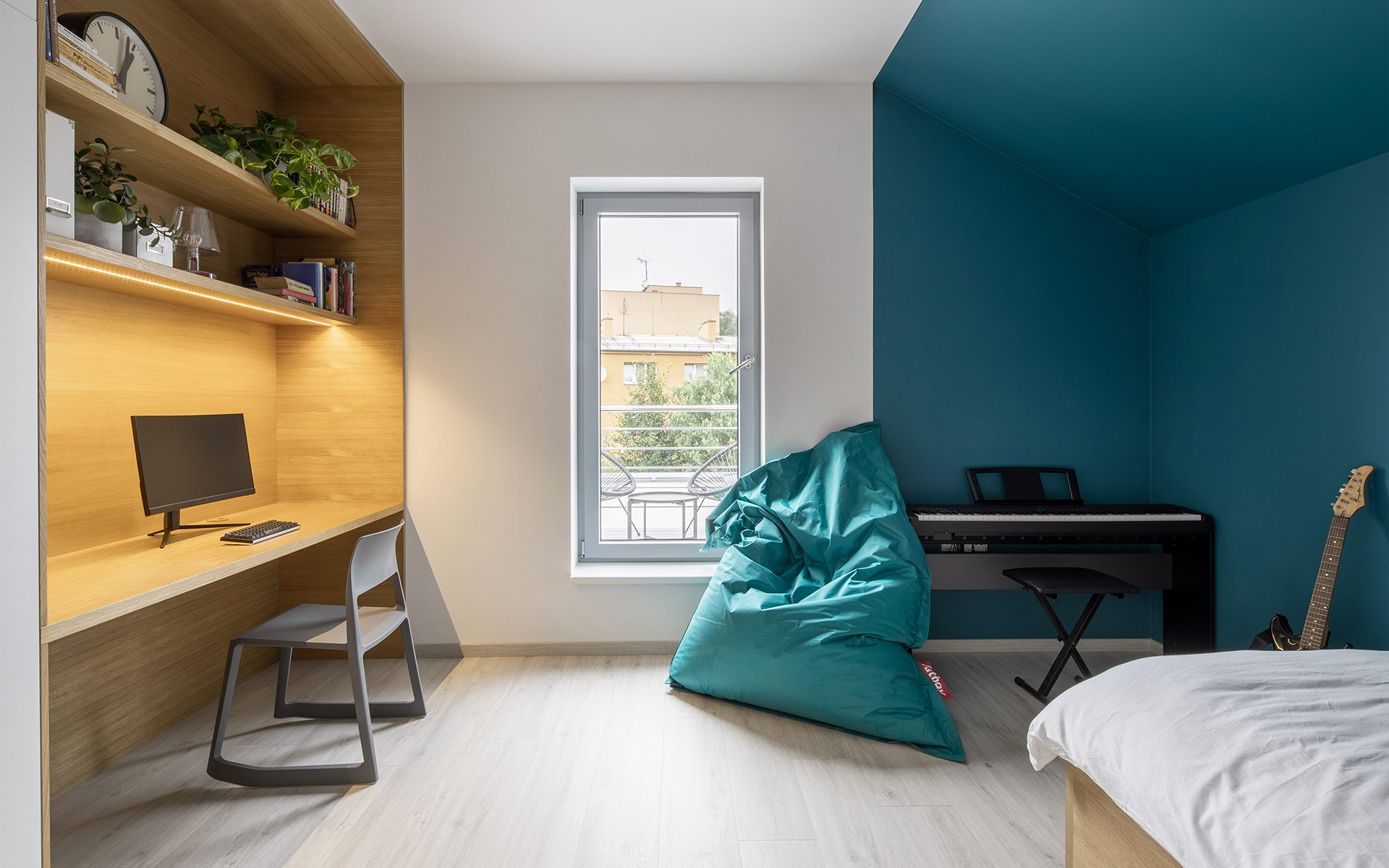 Dvoupodlažní rodinný dům s plážovou atmosférou, kde má každý člen rodiny svůj vlastní kus moře, hýří mnoha odstíny modré a tyrkysové.
