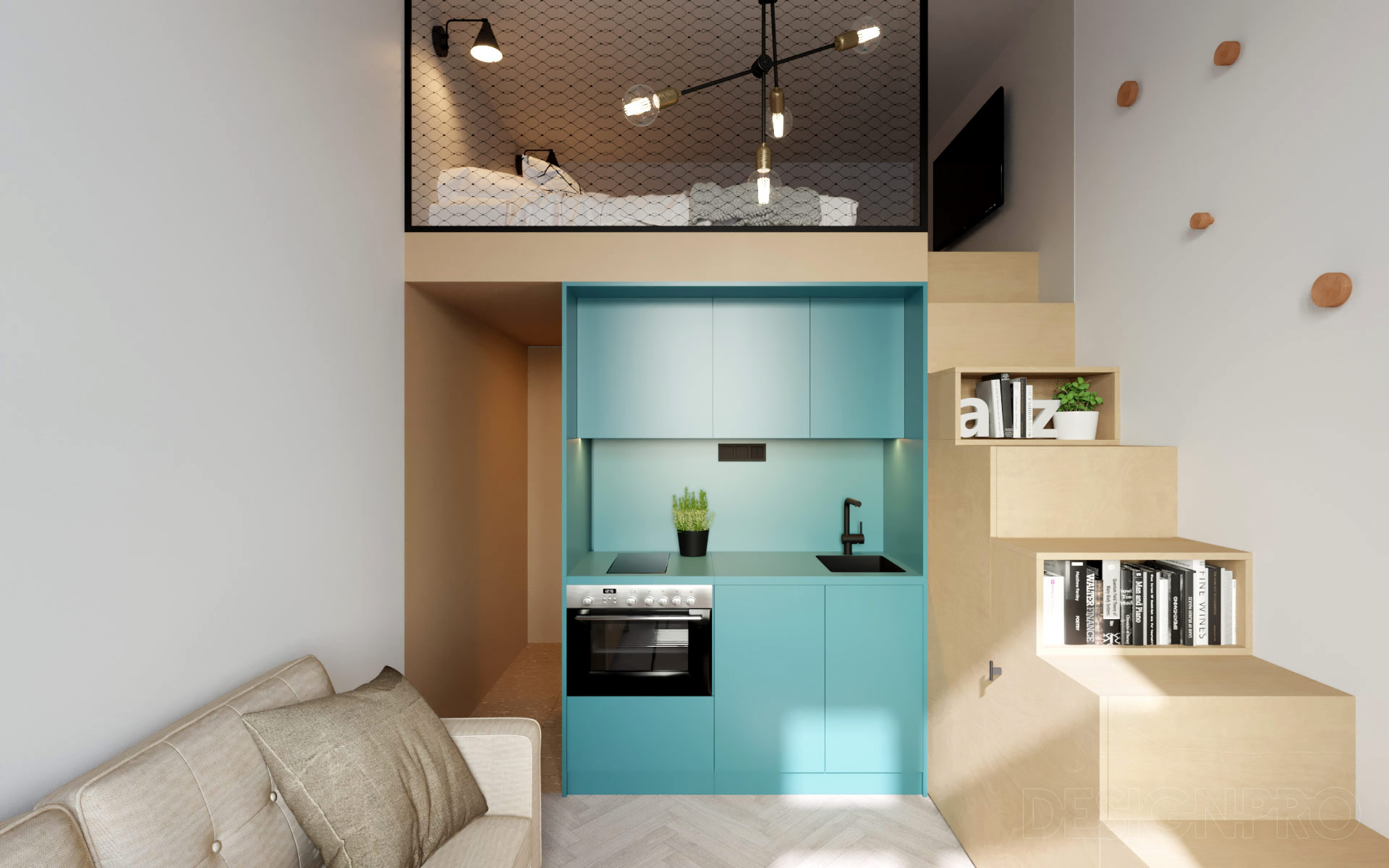 Díky staré zástavbě s vysokými stropy, jsme mohli využít spaní v patře. Pro nedostatek místa se do patra dostanete po schodech, které kromě knihovničky zároveň skrývají chladničku a spíž. Maličkatá kuchyňka v sobě má všechny moderní spotřebiče: Lednici s mrazákem, varnou desku, troubu, mikrovlnku, odsavač par a dokonce i myčku. Odpočinout si můžete na menší pohovce a večeři servírovat na kulatém stolu pod velkým špaletovým oknem. Šatní skříně jsou umístěny z druhé strany kuchyně tak, aby odclonili přímý pohled od vstupu do obytné části bytu. Zároveň vytvářejí chodbičku k toaletě, aby byla co nejdále od zbytku bytu.