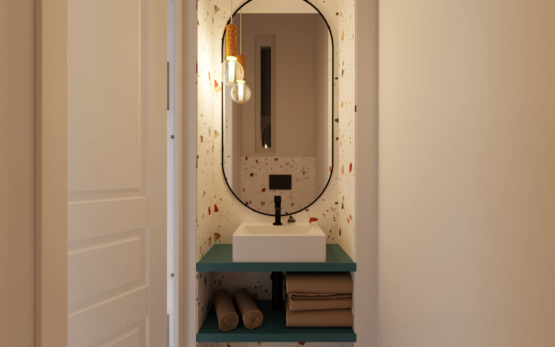 Aby takto maličký prostor nepůsobil ponure, rozhodli jsme jako ústřední barvu použít sytě modrou a doplnit ji o příjemnou texturu dřeva na nábytku i podlaze a béžové tóny na stěnách. Hravost interiéru jsme chtěli dostat i do koupelny a tak jsme zvolili terazzo obklad s barevnými segmenty a nechali zde odkrýt cihlovou klenbu. Vše je doladěno černými doplňky industriálního ražení a svítidly pro vytvoření vícero příjemných večerních nálad.